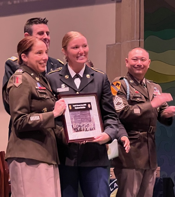 MOAA Award Recipient rising MS4 Cadet Reese Kropp presents thank you momento to Colonle Yesenia Garcia, Commander 704th Military Intelligence Brigade.