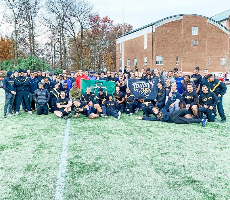 Loyola-Towson Army ROTC Greyhound Battalion celebrates after a victory over thier friendly rivals the Johns Hopkins Blue Jay Battalion in their annual Turkey Bowl game prior to Thanksgiving 2019. The annual game brings the two programs seperarted by less than a mile together in healthy competition and bragging rights.